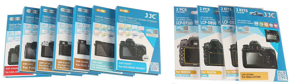 Vi har två varianter av LCD-skydd för kameror. Det ena är JJC Optical Glass LCD Screen Protector (GSP) av härdat, ultra-tunt optiskt glas. Det andra är JJC LCD Guard film som är som en tunn film, som sätts som skydd över LCD-displayen.