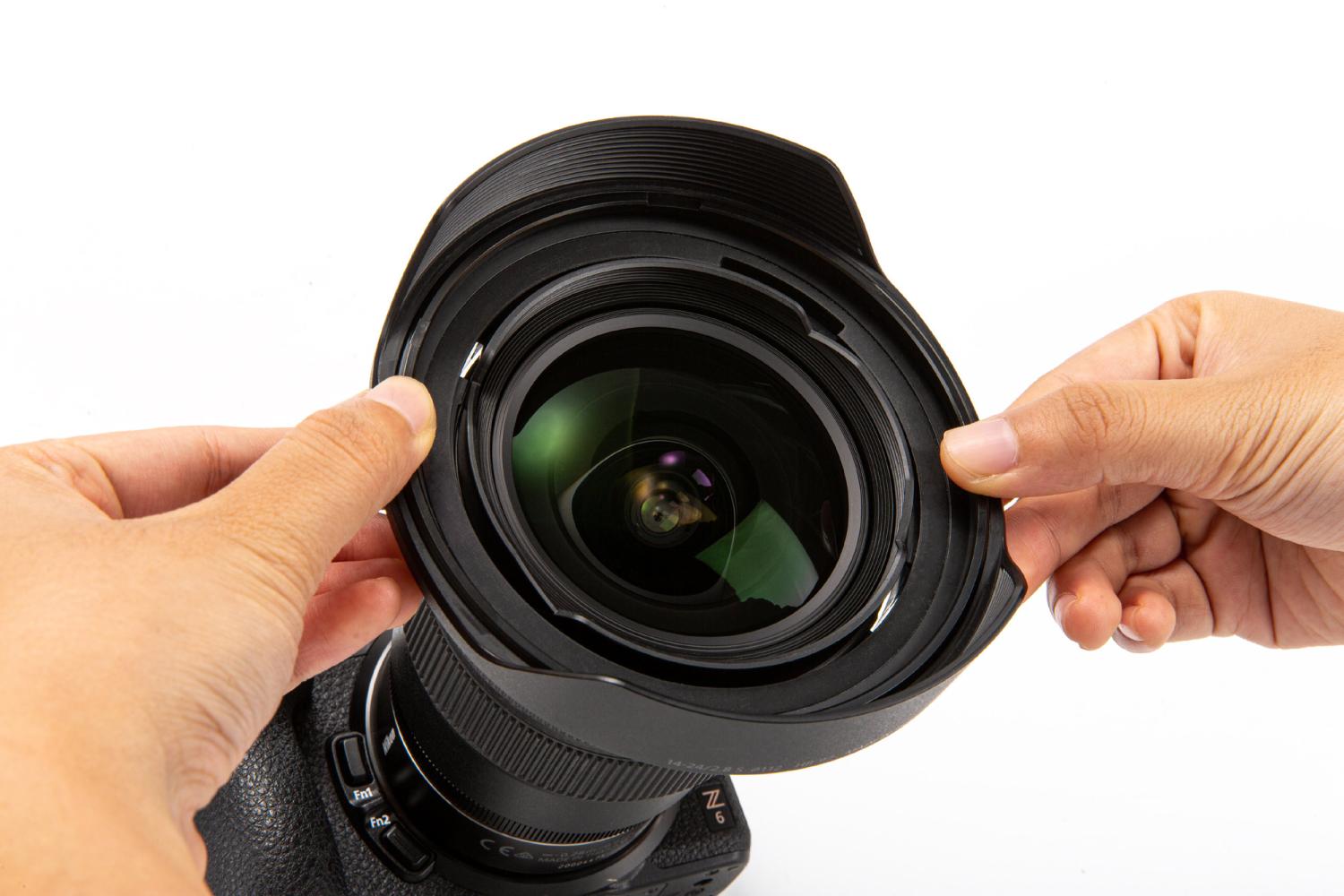 Nikon Nikkor Z 14-24mm f/2,8 S med magnetisk adapterring monterad i gängan på motljusskyddet.