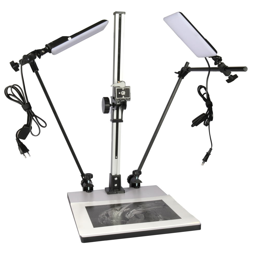 Repro-paket med reproställ och 2 moderna LED-belysningar. Perfekt för dig som vill fotografera av dia, negativ, fotografier, skisser, böcker mm.