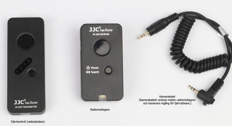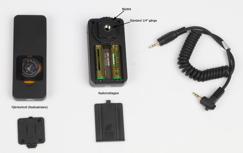 Förpackningen innehåller en fjärrkontroll (radiosändare), en radiomottagare och en kamerakabel (samt batterier till sändaren och mottagaren).