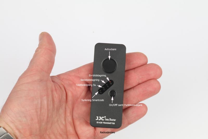 Genom att trycka på den lilla knappen så man kan växla mellan en-bildstagning (Bulb), seriebildstagning*, tidsfördröjning och Synkning Smartcode. Börja med att ställa fjärrkontrollen på en-bildstagning. Testa och tryck ned avtryckaren (stora knappen) på fjärrkontrollen. Då ska det blinka till (grönt ljus) på både sändaren och radiomottagaren. Om fjärrkontrollen inte får någon kontakt med radiomottagaren, så måste du "para ihop" radiosändaren med radiomottagaren.