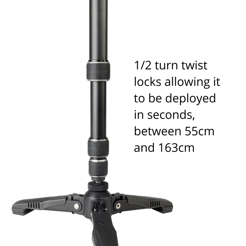 Vanguard VEO 2S AM-264TR Monopod är ett perfekt enbensstativ att använda vid t.ex fotografering, videofilmning eller för fågelskådning med tubkikare. Enbenstativet är utdragbara till fyra sektioner, med praktisk och bekväm Twist-Lock låsning. Tack vare att låsning sker efter ¼-varv, så går det snabbt att justera höjden på enbensstativet. Maxhöjden är 1,6m. Transportlängden är 55 cm. Max belastning är 15 Kg. Enbensstativet har standard 1/4" kameragänga.