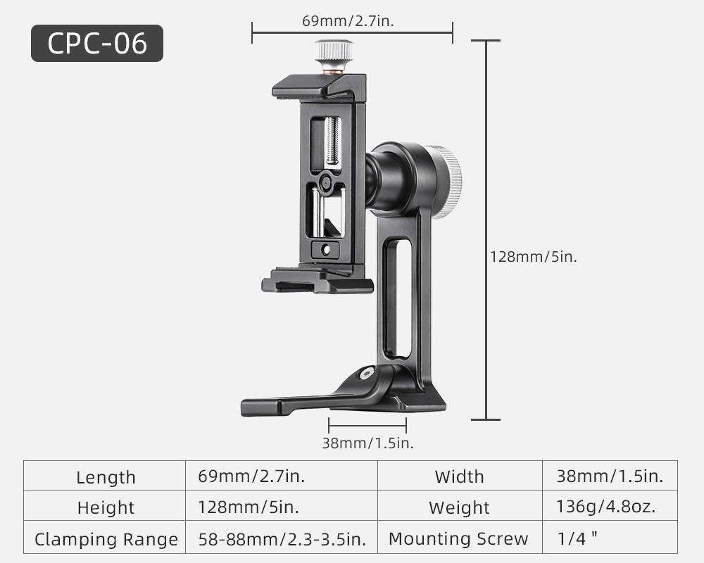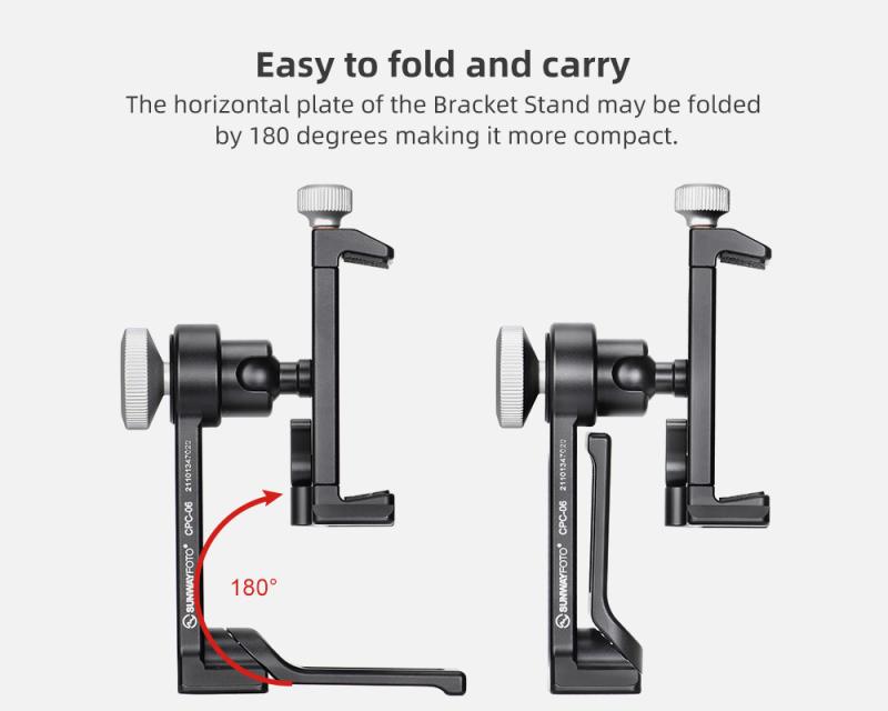 Sunwayfoto® CPC-06 Mobile Phone Bracket/ Stand är förmodligen marknadens bästa smartphone-hållare! CPC-06 är en Arca-swiss kompatibel och roterbar universalhållare för smartphone, som är tillverkad i T6061 aluminiumlegering, med en hårdanodiserad yta, som i princip uppfyller militära specifikationer på korrosionsbeständighet och hållbarhet. Fästet är försedd med standard 1/4" kameragänga (för t.ex montering på stativ eller dolly) och Dovetail-spår för montering i ett Arca-Swiss kompatibelt snabbfäste! Dessutom kan man fälla ut en aluminiumfot, som gör det möjligt att ställa mobilhållaren på t.ex ett bord. Det följer även med blixtfot i metall som gör det möjligt att montera hållaren i en standard blixtsko.