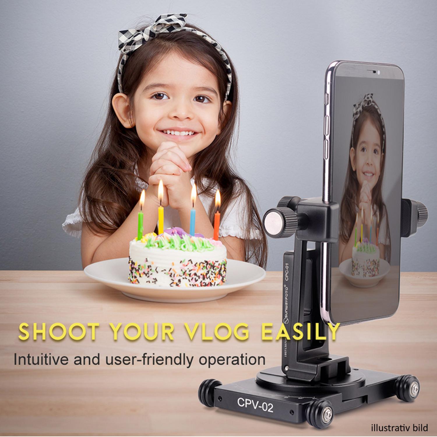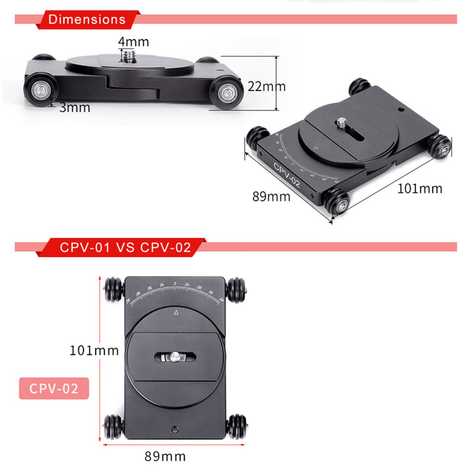 Ett prisvärt paket med en CPV-02 Camera Dolly, komplett med en Sunwayfoto CPC-06 fäste för smartphones (Gripvid: 58-88mm). CPV-02 Camera Dollyär en mycket smidig och ultrakompakt kameravagn för filmning för t.ex videobloggar, youtube och eller annan webbproduktion. Förutom klassiska kameraåkningar, så kan man även använda vagnen för att filma motiv och produkter i 360°. Det går nämligen att ställa in vinkeln på framvagnen för olika svängradier. Cirkeldiametern blir från 12,3 cm till oändligt beroende på inställd vinkel. Dolly-vagnen har en robust och elegant konstruktion (eloxerad aluminium) med gummiförsedda aluminium-hjul, vilket minskar risken för ljud och vibrationer. Vagnen har en D-ring skruv med standard 1/4" kameragänga för montering av t.ex CPC-06 på kameravagnen. Kameraskruven löper i ett spår som gör det möjligt att positionera fästet i sidled. Vagnen har även ett hål för fäste av en lina.
