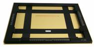 Denna bild visar en proffessionell avmaskningsram med fyra linjaler. Linjalerna är tillverkade av rostfritt stål och kan därför hållas mycket tunna, vilket gör att det inte blir någon kant som kan reflektera ljuset in på kopian. Linjalerna är icke-reflekterande matt-svarta och även när ramen är inställd för max-format så finns det gott om plats ut till linjalernas infästningar. Bottenplattan är lackad i ”Focal-Yellow”, som inte reflekterar några ”skadliga färger” till fotopapperet eller ut i mörkrummet.