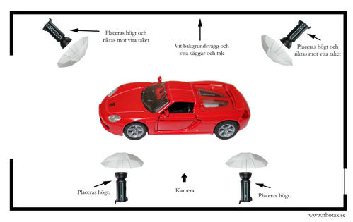 Skissen visar hur man kan bygga en fotostudio för professionell fotografering av bilar med systemkamera. Det behövs 4st studioblixtar (400Ws) som placeras enligt skissen. Använd vita paraplyer för att få ett mjukare ljus och större lysande yta. Placera blixtarna högt. Väggar och tak måste vara vita. Använd en radiosändare i kamerans blixtsko, så att du kan styra dem från sändaren.
