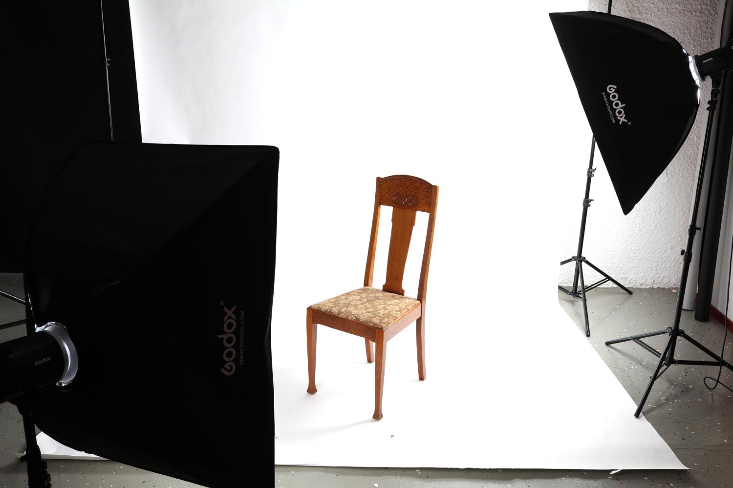 Här har vi riggat upp med 3st Godox SL100D belysningar. Fördelen med belysningar är att man ser direkt på motivet hur ljuset faller. Nackdelen är att det inte alls blir samma ljusmängd som med studioblixtar. Man får jobba med en större bländare (mindre skärpedjup) eller högre ISO. I det här fallet så är det en belysning mot motivet (stolen) och två belysningar mot den vita bakgrunden. Belysningarna var inställda på 100% och kameran på 1/60s, bländare f/4 och ISO 100. Använd paraply eller softbox på motivblixten. Vid större motiv använd fyra belysningar (2 på motivet och 2 på bakgrunden).