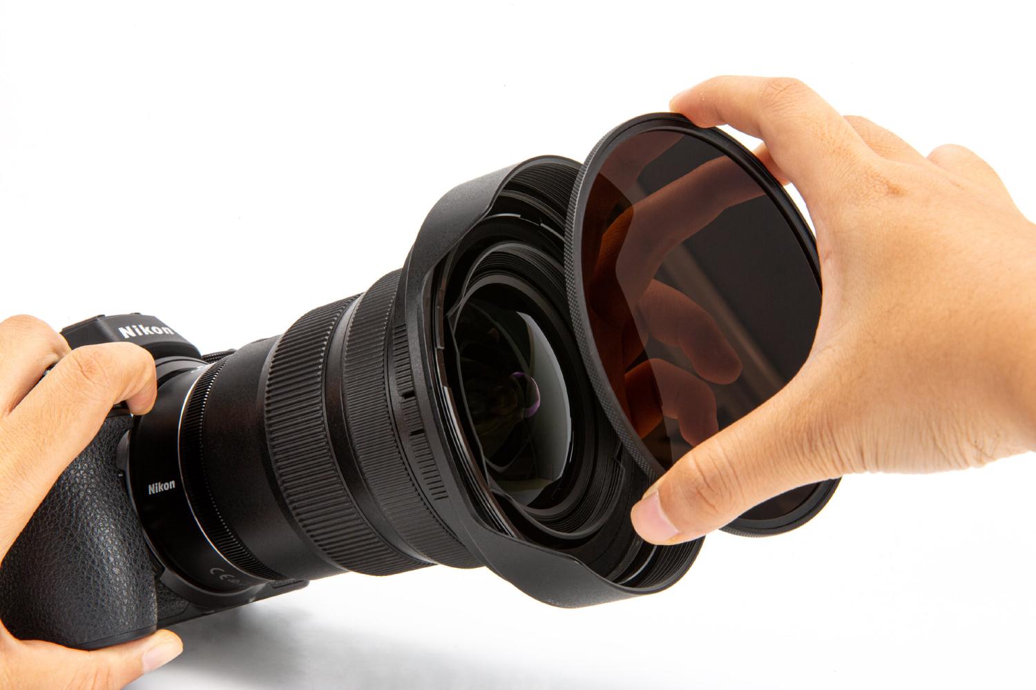 Nikon Nikkor Z 14-24mm f/2,8 S med magnetisk adapterring monterad i gängan på motljusskyddet.