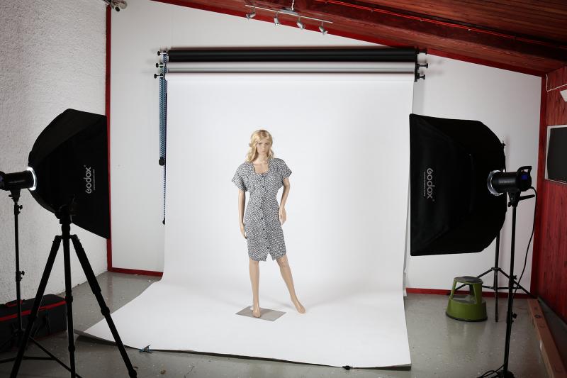 Det är tillräckligt kraftfullt för att plåta såväl gruppbilder som interiör. Ovanstående bild visar riggningen när vi plåtade skyltdockan mot en vit bakgrund. Tack vare softboxarna på studioblixtarna så får man ett fantastiskt mjukt och fint ljus. Blixtljuset från Godox MS300V blixtarna räcker till för att ljussätta hela bredden av bakgrunden (2,72m). Att plåta med studioblixtar är verkligen både kul och lärorikt och inte alls komplicerat.