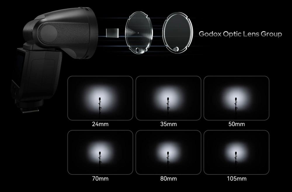 Godox V1 MID har ett runt blixhuvud med optisk konstruktion (Godox Optical System) för en mer naturlig och jämn ljusspridning. Bättre anpassat för fler objektiv, då ljusspridningen på V1 MID är anpassat ner till 24mm i brännvidd. Godox V1 och V100 har ner till 28mm. (Bilden visar ljusspridningen från V1 MID.)