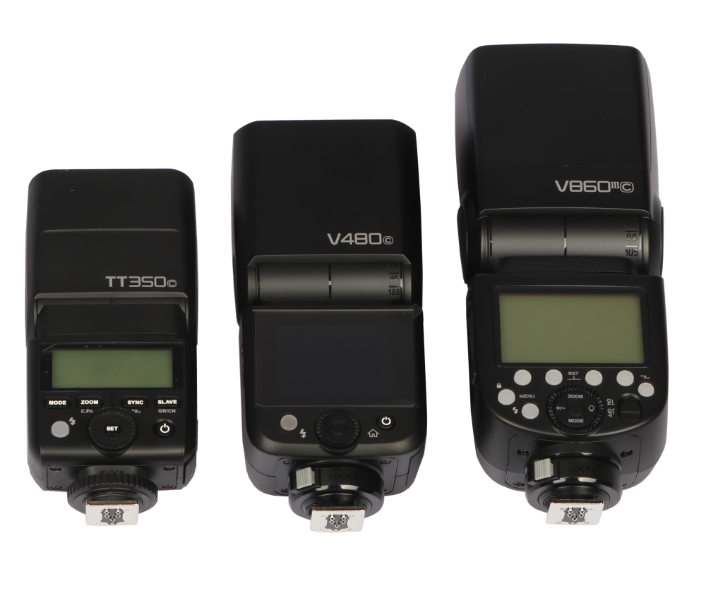 Godox V480 är en kompakt kamerablixt , som hamnar i storlek mellan ultrakompakta TT350 och en vanlig kamerablixt (V860III). Trenden går mot att många fotografer vill ha mindre och lättare utrustning, så V480 känns helt rätt i tiden. Tjockleken skiljer också mellan blixtarna, vilket syns bättre på bilden nedan.