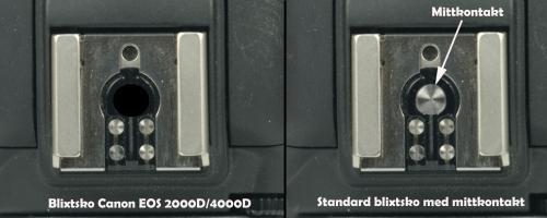 Canon EOS 2000D och 4000D har en egen variant av blixtsko, som inte ens stödjer alla funktioner hos blixtarna i Canon Speedlite EX-serien. Då kamerorna saknar standard mittstift i blixtskon, så är de inte kompatibla med radiosändare (för användning med studioblixtar), universalblixtar, universalsändare, standard blixtsko-adaptrar, andra fabrikat av kamerablixtar eller andra typer av Canon-blixtar. Det går alltså inte ansluta en radiosändare i kamerans blixtsko för att använda systemkameran tillsammans med studioblixtar.