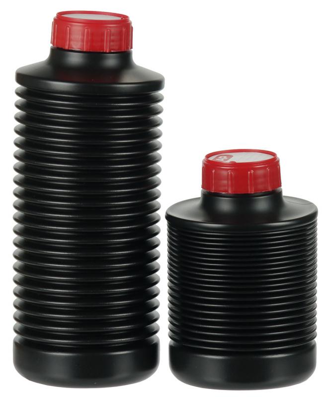 Hoptryckbar bälgflaska, dragspelsflaska för effektiv kemiförvaring. Genom att trycka ur luften ur flaskan så minskas risken för att kemin ska oxidera.