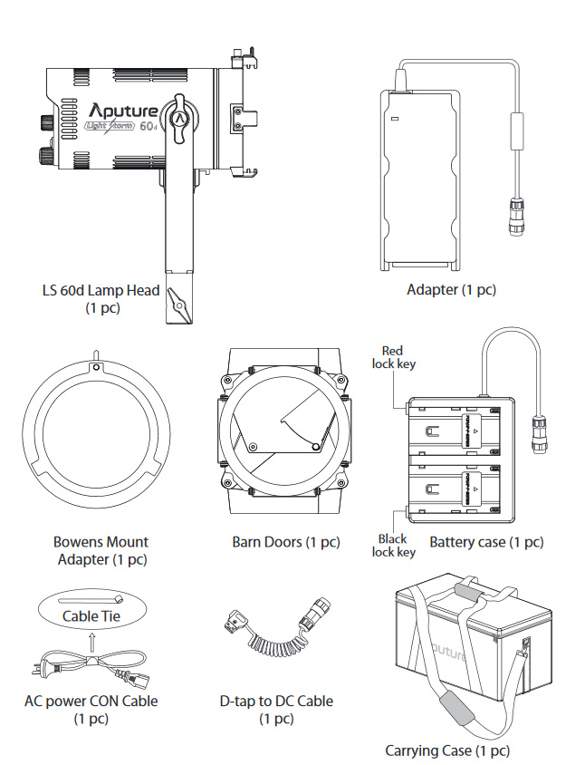 Aputure Light Storm 60d kan förutom att drivas av den medföljande 230V nätadaptern även drivas via DTap (av ett V-mount batteri*) eller av två 2 stycken NP-F960-batterier*. (Det går även köra belysningen på bara ett F960-battteri, men då avger belysningen bara halva ljusmängden.) Belysningen levereras med en 230V nätadapter, samt med en DTap-kabel och en batteriadapter för två NP-F960-batterier. (*Batterier och laddare ingår ej. Se underst på sidan)
