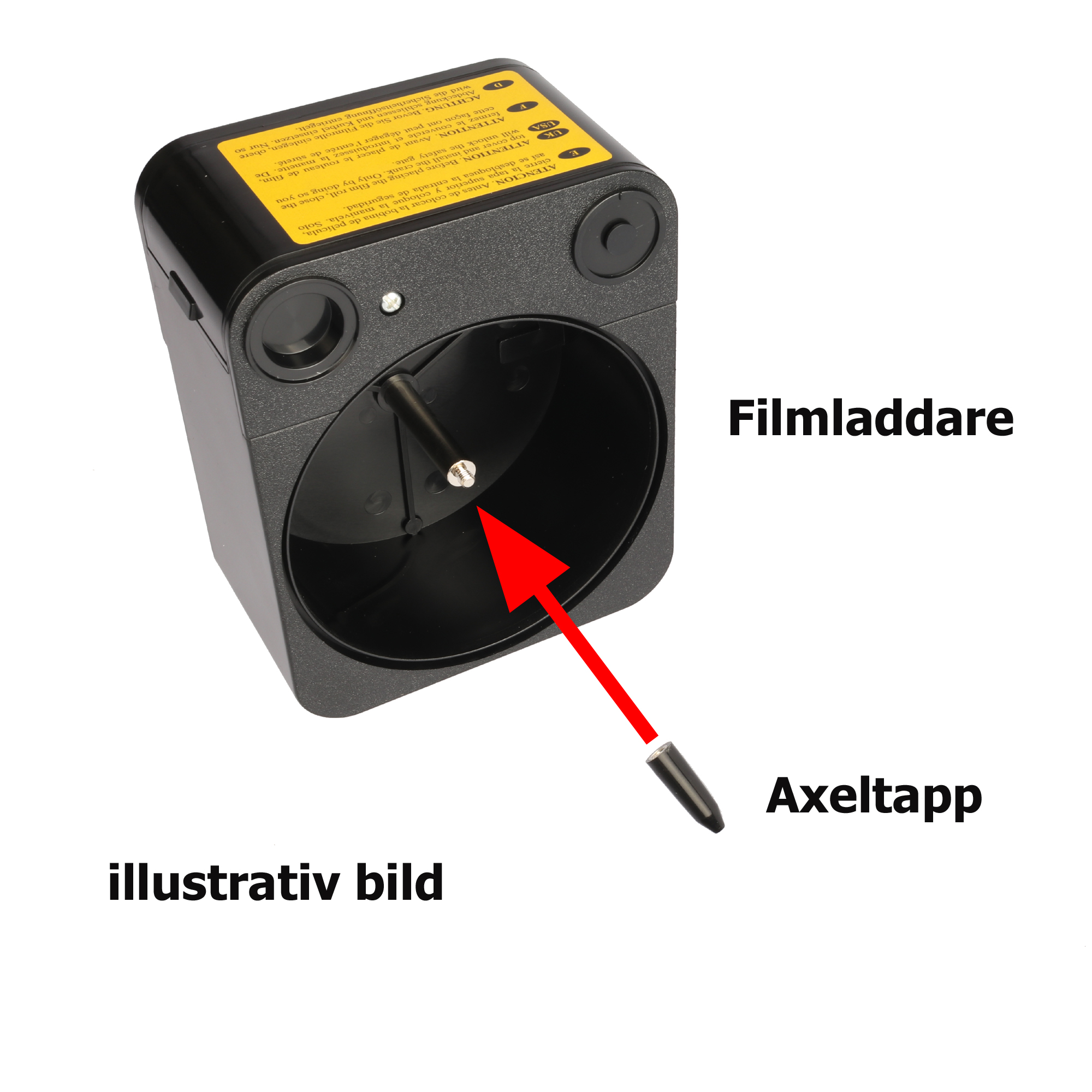 Axeltappen skruvas fast på axeln på A-P filmladdare för att underlätta laddning av råfilm. Filmladdare ingår ej.