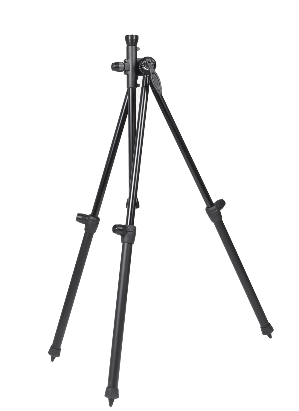 - Placera de två andra benen i önskad vinkel och önskat läge. (Den unika fördelen här är alltså att benen kan placeras där det är mest fördelaktigt med hänsyn till bland annat markens beskaffenhet). Tryck ned spetsarna i marken. Vid behov kan benens utdrag förändras för att kompensera för ojämnt underlag.