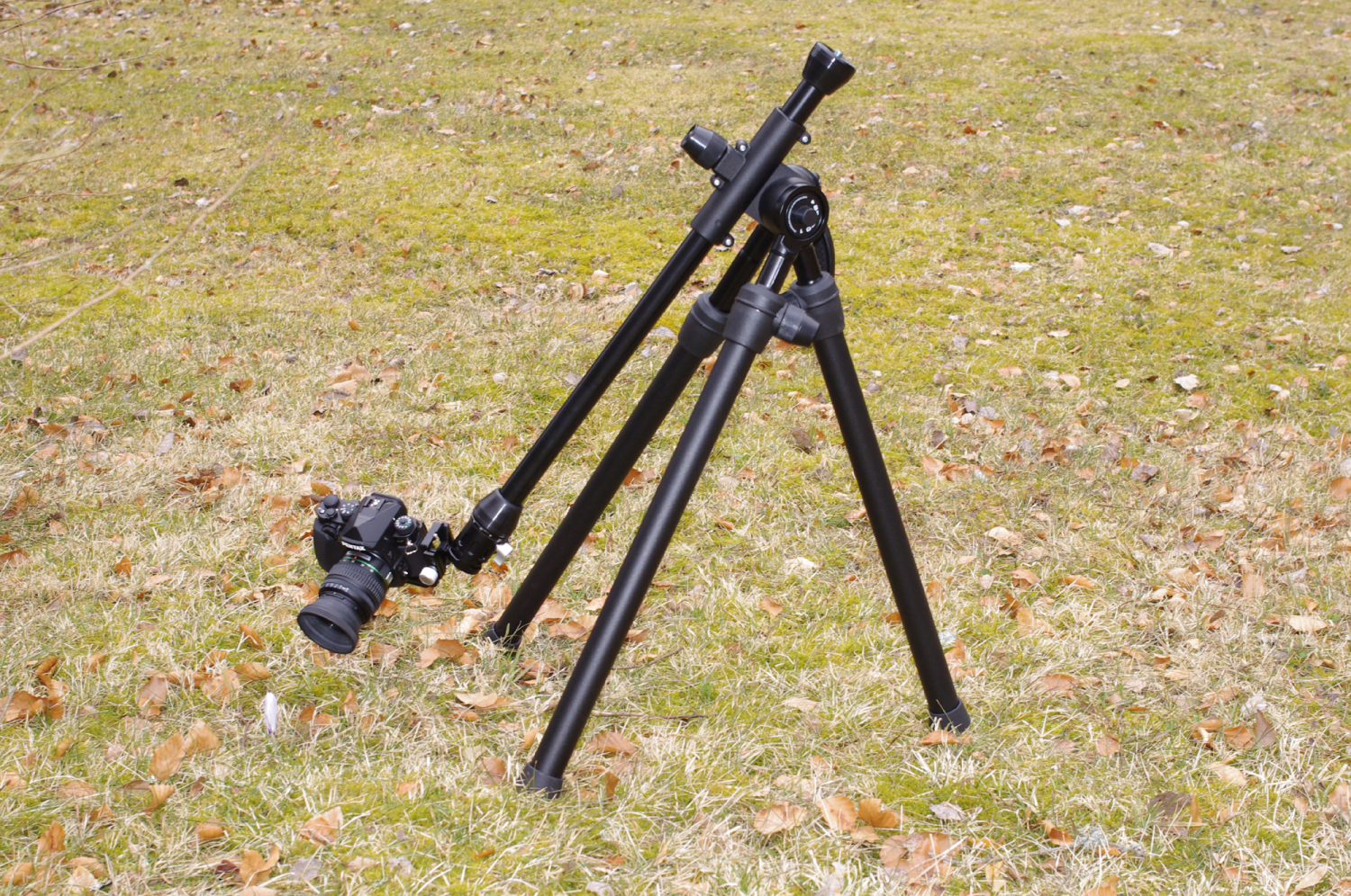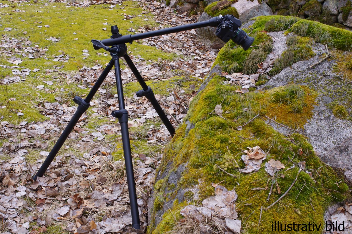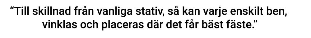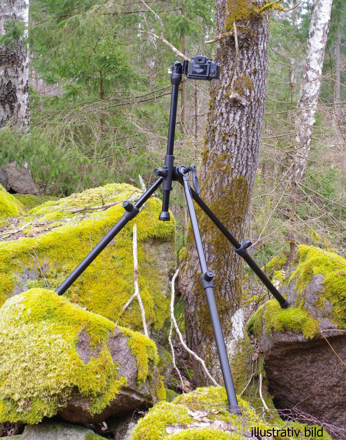 illustrativ bild. Till skillnad från vanliga stativ, så kan varje enskilt ben vinklas och placeras där det får bäst fäste. (Kulled, kamera, fotoväska mm ingår ej.)