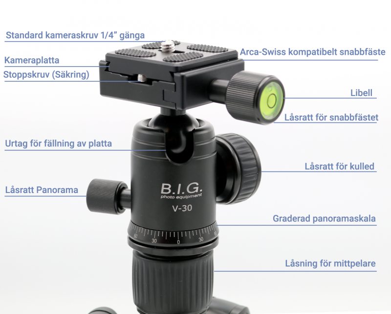Kulleden V30 har graderad panoramabas och integrerat snabbfäste, som gör möjligt att snabbt växla mellan olika kameror eller mellan t.ex en kamera och en tubkikare. (Extra kameraplattor finns som tillbehör. Se underst på sidan.) Kulleden har urtag för fällning av kameraplattan 90° för fotografering med kameran i "höjdformat". Standard kameraskruv 1/4".