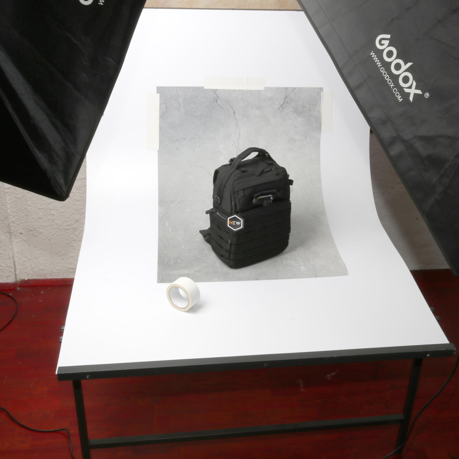 Här har vi plåtat en fotoryggsäck från Vanguard. Vi har tejpat upp bakgrunden, så att den både är under och bakom motivet. Matt gaffatejp är studiofotografens bästa vän.