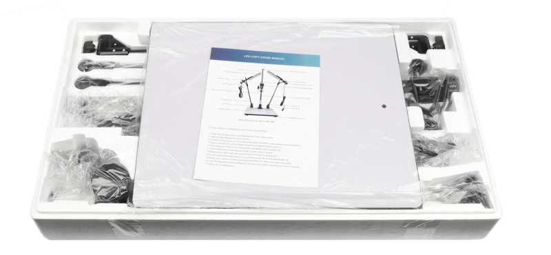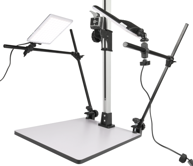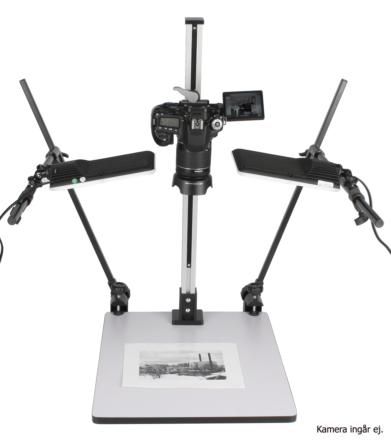 Fotobestway CS-105 reproställ är ett riktigt bra "repro-paket" för dig, som vill fotografera av negativ, dia, fotografier (ex. gamla släktbilder), planritningar, skisser, kartor, tavlor, böcker mm. Reprostället levereras komplett med två moderna 18W LED-belysningar, som avger ett flimmerfritt dagsljus. Tack vare armarnas rörlighet, så kan man positionera belysningarna optimalt i förhållande till bottenplattan. Om man köper till ett ljusbord, så kan man använda reprostativet även för avfotografering av negativ och diafilm. Fördelen med att använda Fotobestway CS-105 reprostativ är att kameran och bilden (eller negativet) hamnar parallellt , så att man undviker parallax- och skärpefel. Fotobestway CS-105 har ett praktiskt snabbfäste, som gör det möjligt att snabbt montera på eller av kameran från reprostället. Höjden justeras genom att man vrider på den stora ratten på släden på pelaren. På slädens baksida finns en låskruv, som gör det möjligt att låsa höjden. (Med kameran fullt upphissad på reprostället, så kan man med en 18mm optik plåta av ett A2-papper med lite marginal.)