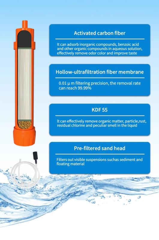 Filtret har avancerad rengöringsteknik, med KDF 55-teknik och aktivt kolfilter, som effektivt tar bort 99.9999% av alla vattenburna bakterier (inklusive E. coli och salmonella), 99,999% av alla parasiter, samt mikroplaster, sediment, lukter, klor, organiskt material och även många tungmetaller. Den här versionen har ett KDF 55-filter, som kan absorbera tungmetaller i vatten och minska joner i hårt vatten som kalcium och magnesium. Filtret uppfyller mycket höga internationella krav när det gäller såväl rening som materialval (SGS Bacteria Filter passed. Produkten följer också NSF/EPA Standard och är naturligtvis CE-godkänd. BPA-fri plast.)