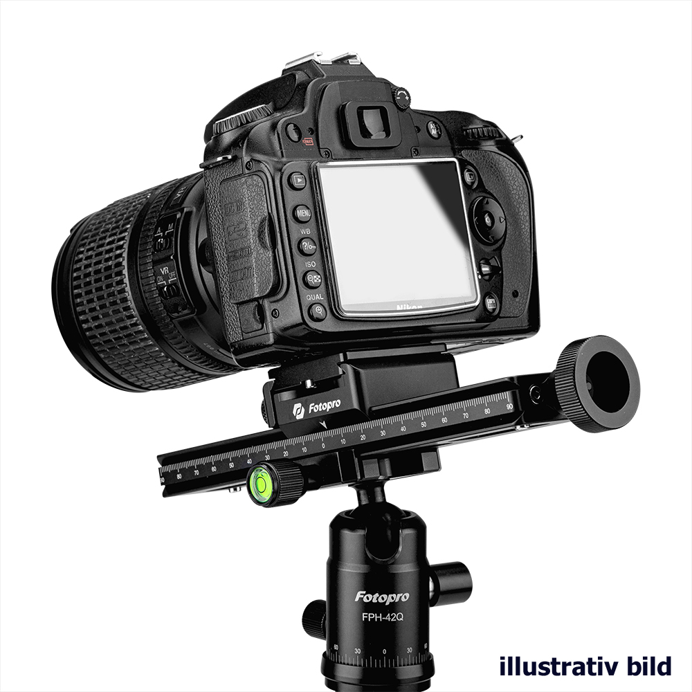 Fotopro FT-100 är en prisvärd Arca-Swiss kompatibel macro- och reprosläde (180mm skena) för t.ex fokusering och fokusstacking. Ett varv med ratten förflyttar släden 14mm. Skenan har millimeter-skala och är graderad ±90mm (180mm). Ratten som används för att förflytta släden har taktila klick och tillverkad i aluminium. Slädens position kan bromsas via ratt. Snabbfästet på släden är Arca-Swiss kompatibelt och levereras med 50mm kameraplatta med standard kameragänga 1/4". Fotopro FT-100 är försedd med Dovetail-spår på undersidan och kan monteras i ett Arca-Swiss kompatibelt snabbfäste. På undersidan finns även två hål med 1/4 gängor för direkt montering på t.ex ett stativ. Fotopro FT-100 är tillverkad av T6061 aluminium-legering.