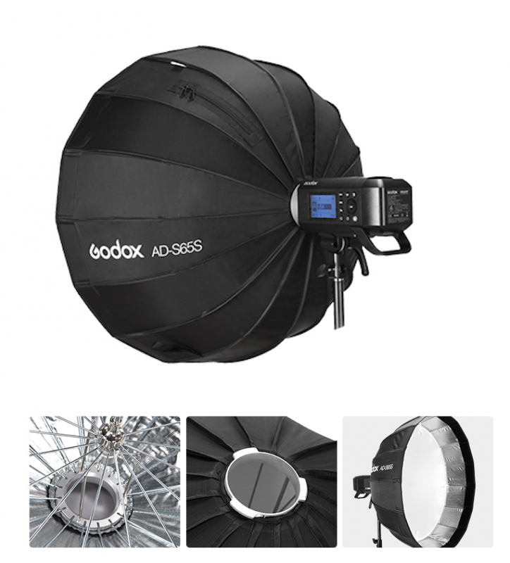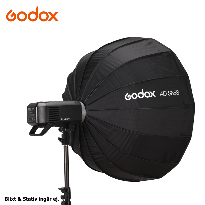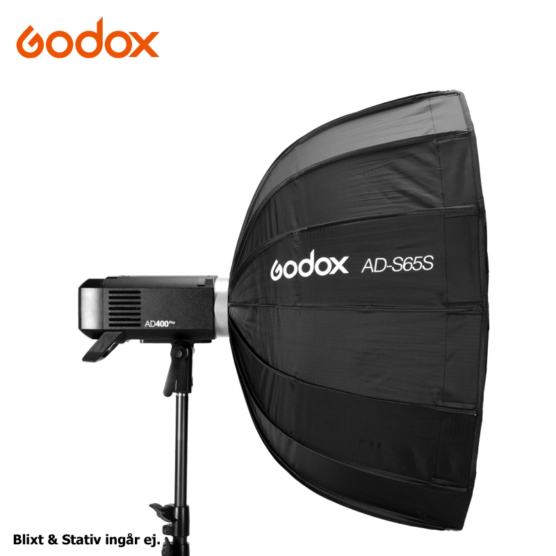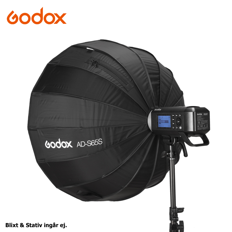 Godox AD-S65 är en Ø65 cm parabolisk softbox, med paraply-konstruktion, Silver insida (S) och dedikerad Godox-X-bajonett för Godox AD 300 Pro, Godox AD 400 Pro och Godox ML60, ML60II och ML100. Softboxen fälls upp på ungefär samma sätt som man fäller upp ett paraply. Till skillnad från vanliga softboxar, så har softboxen en parabloidform, som gör att ljuset från softboxen blir mera riktat och kan t.ex användas på lite längre avstånd från motivet. Tack vare att softboxen har dubbla diffusionsdukar, så får man ett fantastiskt mjukt och fint ljus. Det går också att använda softboxen, som en "beautydish" för t.ex porträtt. Det går nämligen att montera en liten rund reflexskärm i centrumet av softboxen, så att man får ett mjukare och ett mera indirekt ljus. Det följer med fyra olika reflexskärmar (för softboxen), som gör det möjligt att påverka t.ex färgtonen.
