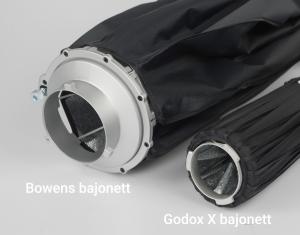 Blixtarna har samma bajonettfattning (Godox-X) som Godox AD400 Pro. Ovanstående bild visar skillnaden i storlek och smidighet mellan Bowens-bajonetten och Godox X bajonetten. Tack vare att Godox AD300 Pro (och även AD400 Pro) har Godox X bajonett, så blir ljusformarna till blixtarna både kompaktare och mera smidiga. Om man köper till Godox S2 Bowens-hållare till dessa blixtar, så kan man även snabbt växla mellan olika ljusformare med Bowens och Godox X-fattning. Det är också möjligt att byta bajonettfattning fram på blixten. Bajonettadapter för Bowens, Broncolor, Elinchrom och ProFoto finns som tillbehör.