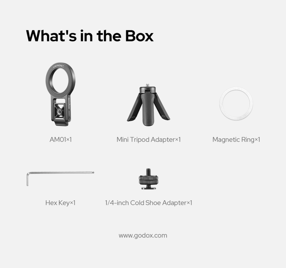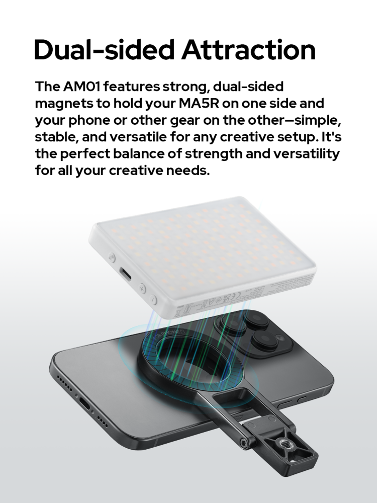 Godox AM01 Magnetic Bracket är en kraftfull och stabil hållare med dubbelsidigt magnetfäste, utrustad med starka N52-neodymmagneter. Den fäster MA5R-belysningen på ena sidan och din smartphone på den andra, vilket gör den idealisk för kreativa videoinspelningar eller livesändningar. Hållaren kan monteras i exempelvis kamerans blixtsko, på en kulled eller användas fristående med det medföljande ministativet.