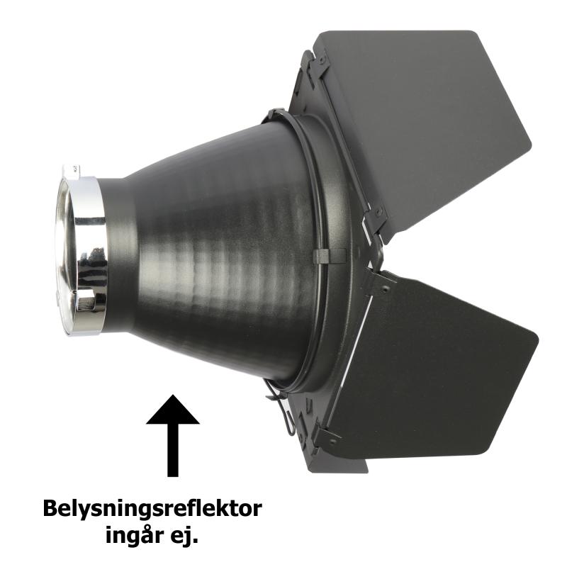 Bilden visar skärmklaffarna monterade på Godox belysningsreflektor RFT-19, som följer med till många av Godox videobelysningar (COB) som t.ex Godox SL150II, Godox SL100D, Godox SL100Bi, Godox Litemons LA200D, Godox Litemons LA200Bi. *Håll koll på värmeutvecklingen om färgade filter används med en fast belysning, så att inte belysningen eller filterna blir för varma.