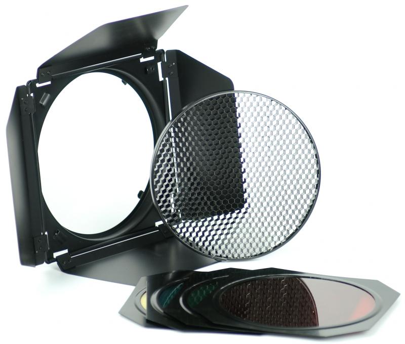 Godox BD-04 är ett mycket prisvärt "tillbehörspaket", som innehåller skärmklaffar, bikakeraster och färgade filter. Skärmklaffar är en av de mest användbara tillbehören i en studio och används för att styra ljusspridningen. Till skillnad från att sprida ljuset åt alla håll så kan man med skärmklaffarna undvika att ljuset träffar en del av motivet eller bakgrunden. Om man eftersträvar en kolsvart bakgrund så kan man med skärmklaffarna "avskärma" bakgrunden så att ljuset bara träffar motivet. Eller naturligtvis tvärtom: Belysa t.ex bakgrunden och inte motivet eller belysa halva bakgrunden...