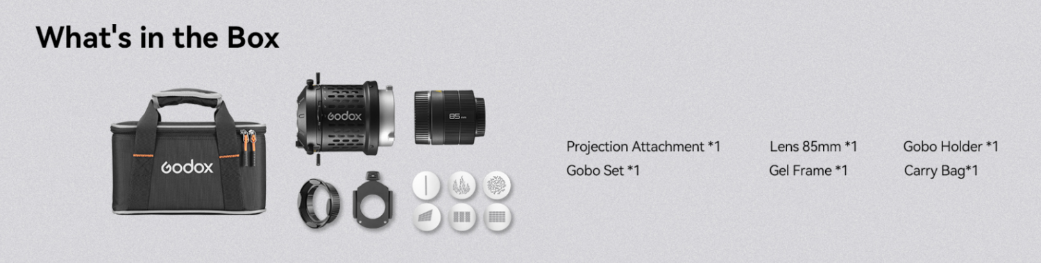 Paketet innehåller en projektor-del, 85mm optik, Gobo-hållare , Gobo-set, filterhållare och en transportväska.