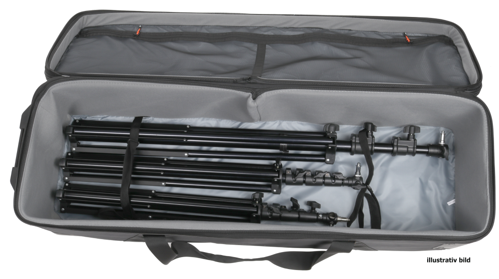 CB-01 väskan rymmer t.ex tre st belysningsstativ i botten på väskan. Sen kan man lägga i ett våningsplan över stativen och fortsätta att packa väskan. På bilden syns belysningsstativ 8008K, 8008XL och 8009 (Stativ ingår ej). För att rymmas i väskan så bör transportlängden på stativen inte överstiga 111cm.