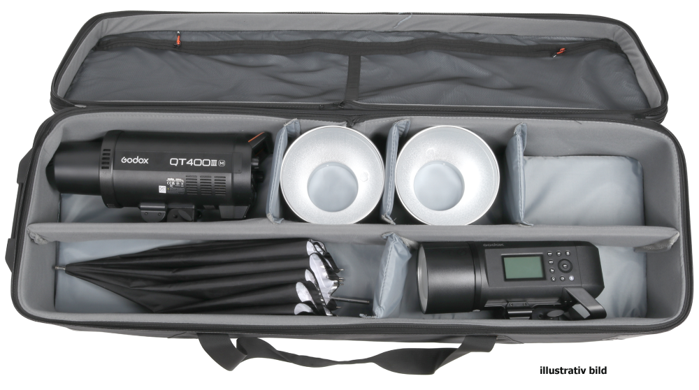 Godox CB-01 är en stor och rymlig studioväska, med hjul och handtag.Väskan har en mycket stabil konstruktion, med förstärkt botten & hårda sidoväggar.
