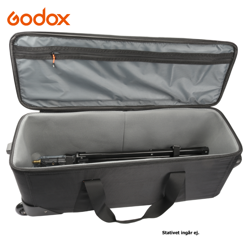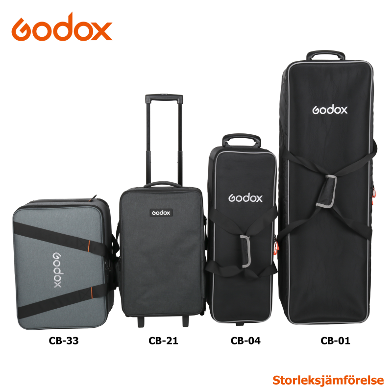 Godox studioväska CB-04 (Nya designen) är en vadderad, stabil och något kompaktare transportväska för t.ex mindre studioblixtar och kompakta belysningsstativ. Väskan har en stabil konstruktion, med förstärkt botten och hårda sidoväggar. Samtliga ytor inuti väskan är dessutom vadderade för att ge ett effektivt skydd åt utrustningen. Väskan är försedd med högkvalitativa "Inlines"-hjul och ett gediget draghandtag, så att man slipper att lyfta väskan när den är tungt lastad.
