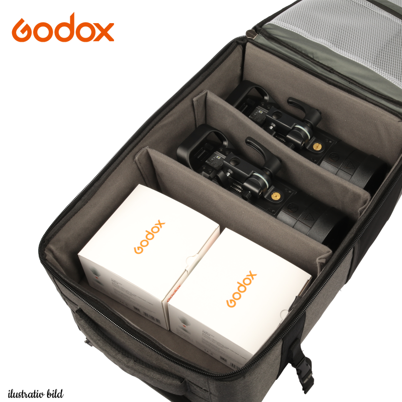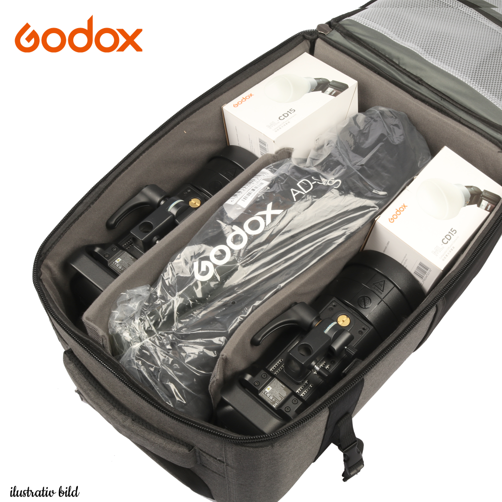 Väskan rymmer upp till 3st Godox AD400 Pro II. På bilden har vi lastat väskan med två AD400 Pro II studioblixtar och ML-CD15 Globar.