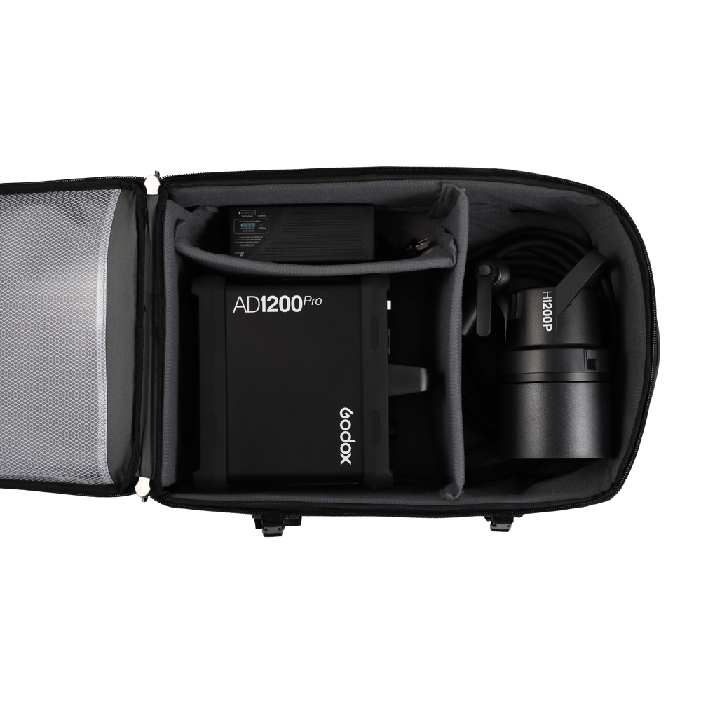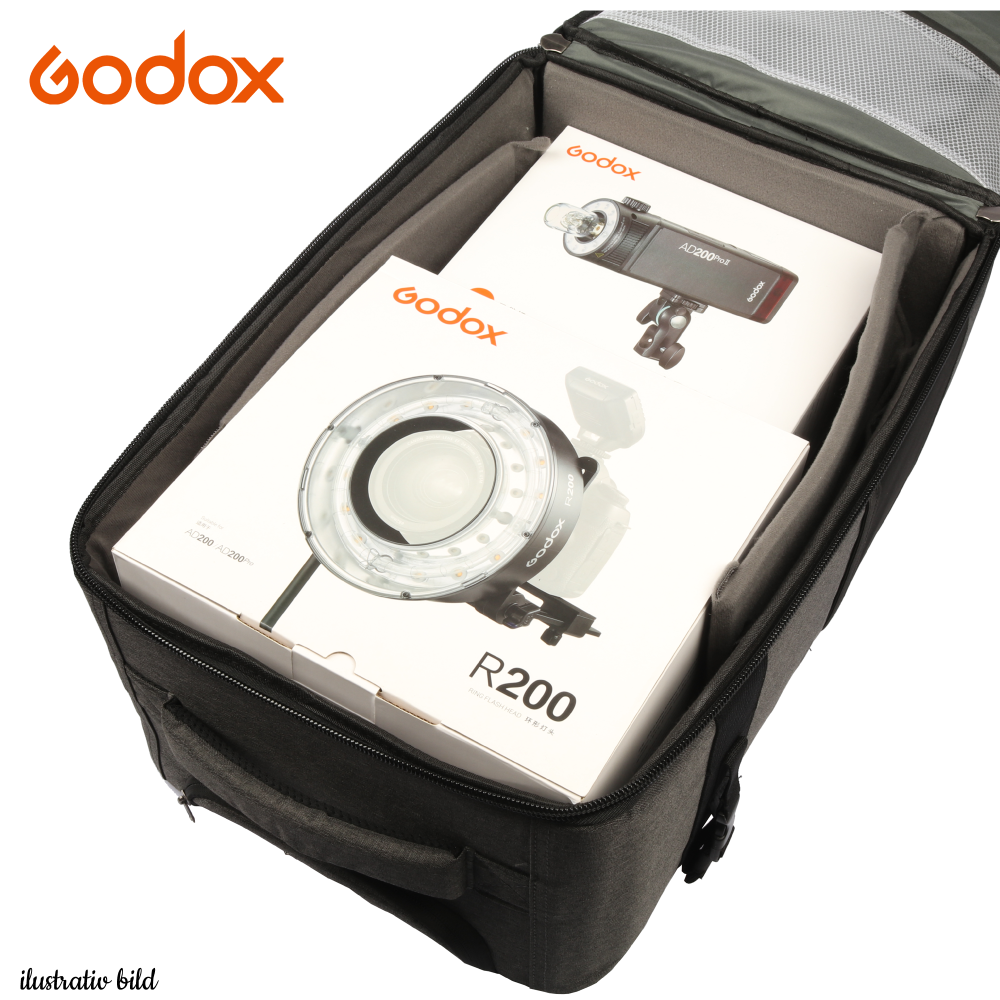På bilden har vi fyllt väskan med en Godox AD200ProII blixt och R200 Ringblixt. Bilderna är illustrativa.