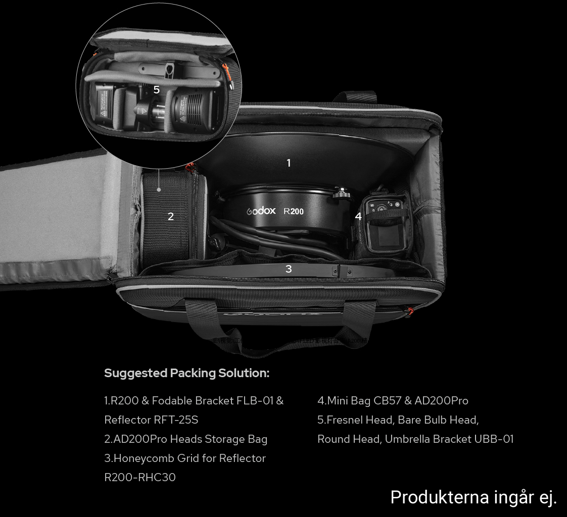 Godox CB56 är en vadderad studioväska som rymmer t.ex en Godox AD200 Pro blixt (eller Godox AD200) och en Godox R200 ringblixt med reflektor. Det följer även med en liten insatsväska, som kan användas för förvaring av Speedlite- och "BareBulb" huvudet för AD200 Pro. Då går det snabbt att växla mellan olika konfigurationer av blixthuvud på AD200 Pro under fotosessionen. Se bilden nedan för exempel på hur man kan packa väskan effektivt. Väskan kan bäras i handtaget eller i axelremmen.