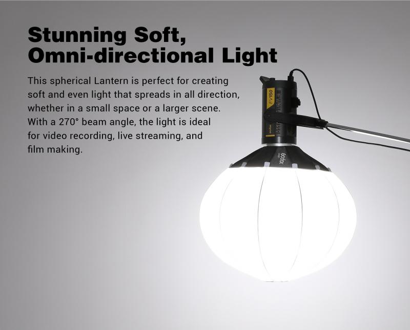 Godox CS85D Lantern ger en  fantastisk ljusspridning  i 270° grader och är perfekt för plåtning av större interiörer med  inriktning mot t.ex mäklare, husföretag, möbelföretag, arkitektur, köks-  och interiörföretag mm.   Softboxen riktas normalt mot taket, som  reflekterar tillbaka ljuset så att slagskuggor undviks. Vid plåtning av  köksinredningar så kan man placera "globen" i brösthöjd, så att ytan under  köksskåpen ljussätts av infallande ljus från globen. "Globen" har en smart konstruktion och fälls upp smidigt på ett par  sekunder. Globen är mycket enkel att transportera, då den levereras i en  avlång transportväska - Uppfälld så har globen en diameter  på cirka 85 cm. Globen har Bowens-fattning och passar t.ex Godox blixtar med Bowens-fattning