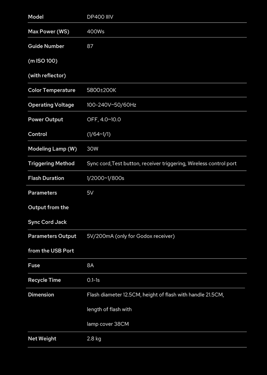 Godox DP400III-V är en kraftfull studioblixt (400Ws), med snabba uppladdningstider (0.1-1s), stort effektomfång på 6 steg (1/1-1/64) och hög repetitionsnoggrannhet. Blixten har även fått ny modellbeteckning (V) och uppdaterat inställningsljus (med modern LED-teknologi) istället för en halogen-lampa. Dessutom så har blixten många smarta funktioner, som t.ex proportionerligt inställningsljus (30W LED), optisk slavsensor med Preflash-stöd, Blixt-klar via ljudsignal, integrerad radiomottagare (Wireless X) mm. Godox DP400IIIV har Bowens-fattning, vilket är samma bajonettfattning som t.ex Aputure, Visico, FotoBestway, Godox och således ett av marknadens största tillbehörsprogram av ljusformare. Studioblixten är avsedd för studiobruk och ansluts via nätkabel till vanligt eluttag (230V).