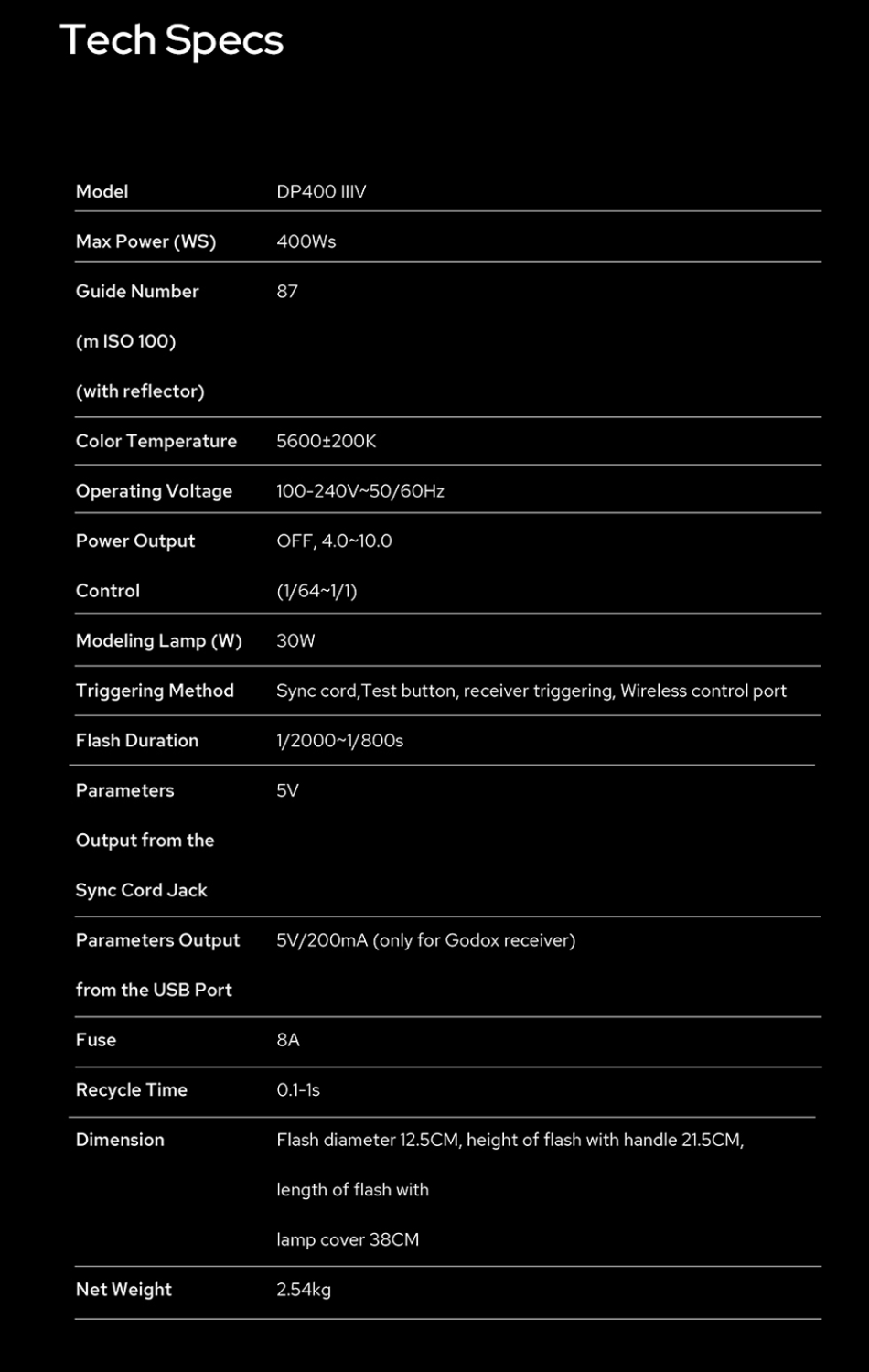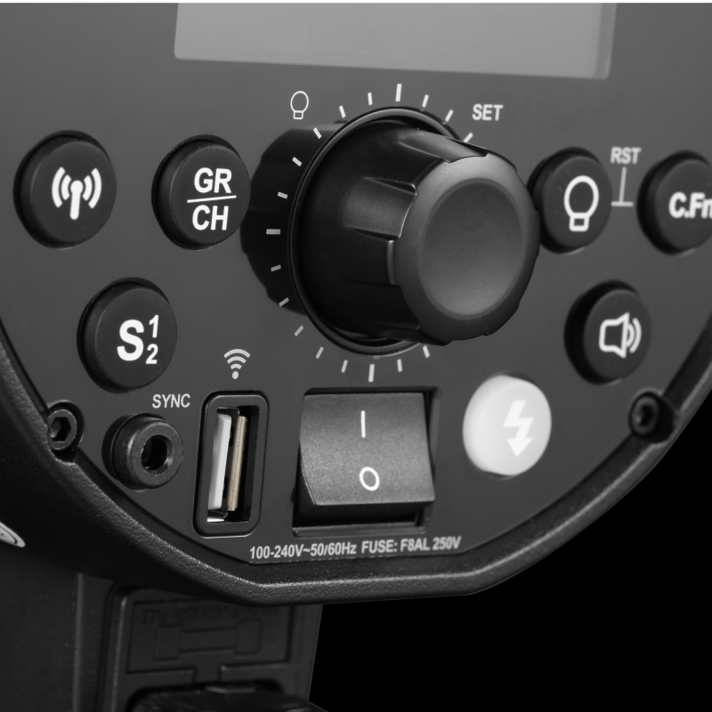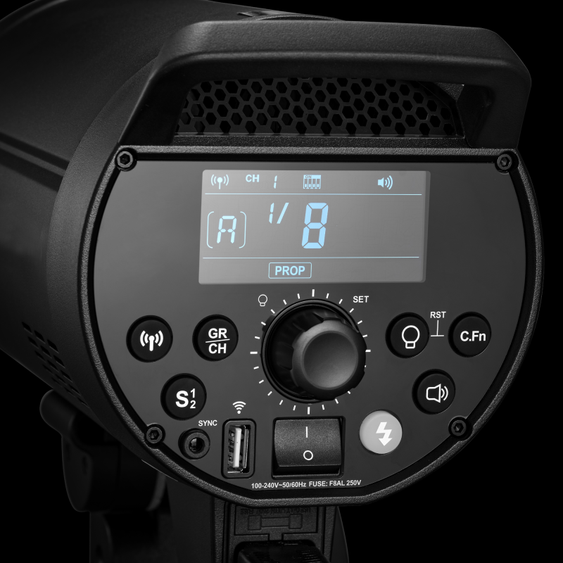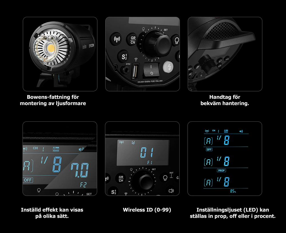 GodoxDP400IIIV är kraftfulla och manuella studioblixtar på 400Ws, med ett stort effektomfång på hela 6 Steg, alltså 7 inställbara bländarvärden ! Effekten på blixten kan alltså ställas in från 400Ws ner till 6,25Ws (i steg om 10-delar). Effekten visas tydligt på den bakgrundsbelysta LCD-displayen på baksidan av blixten.