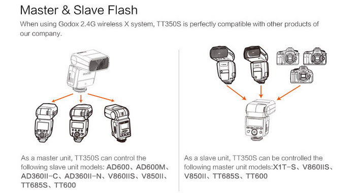 Godox TT3350 kan monteras i kamerans blixtsko eller användas bredvid kameran, som en slavblixt vid motivet (och styras antingen optiskt eller via det inbyggda radiosystemet. Radiosändare ingår ej.). Blixten kan även användas som en Master-blixt och styra andra kompatibla blixtar via det inbyggda radiosystemet (Godox Wireless X).