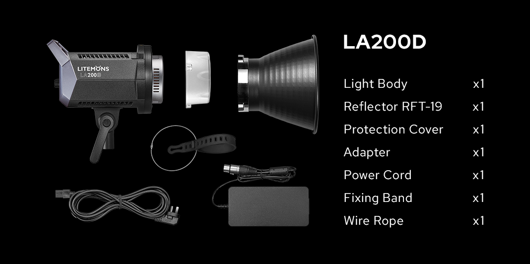 Godox Litemons LA200D har Bowens-fattning, vilket ger tillgång till marknadens största sortiment av ljusformare från t.ex Aputure, Godox, Visico, Bowens, Fotobestway mfl. Tack vare bajonett-fattningen så kan man snabbt och enkelt att byta ljusformare på belysningen. Belysningen har även paraply-fäste.