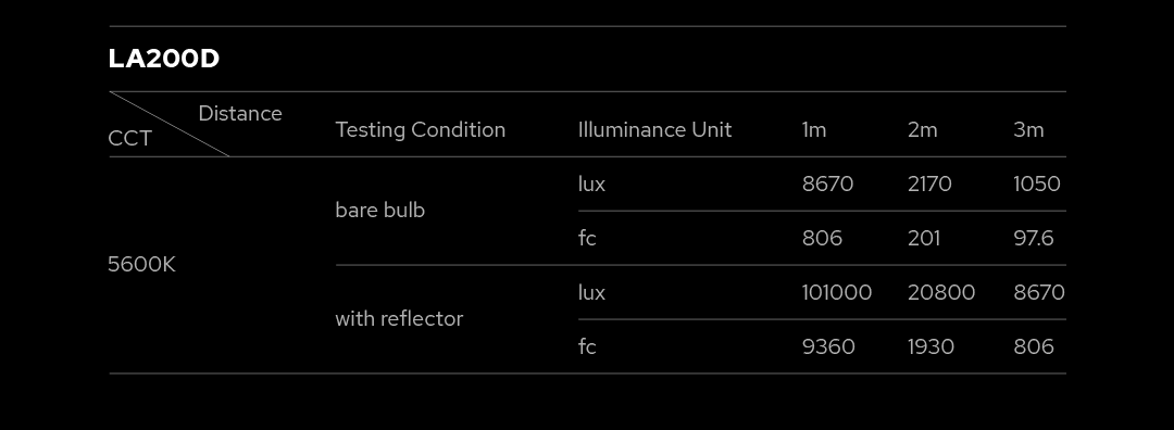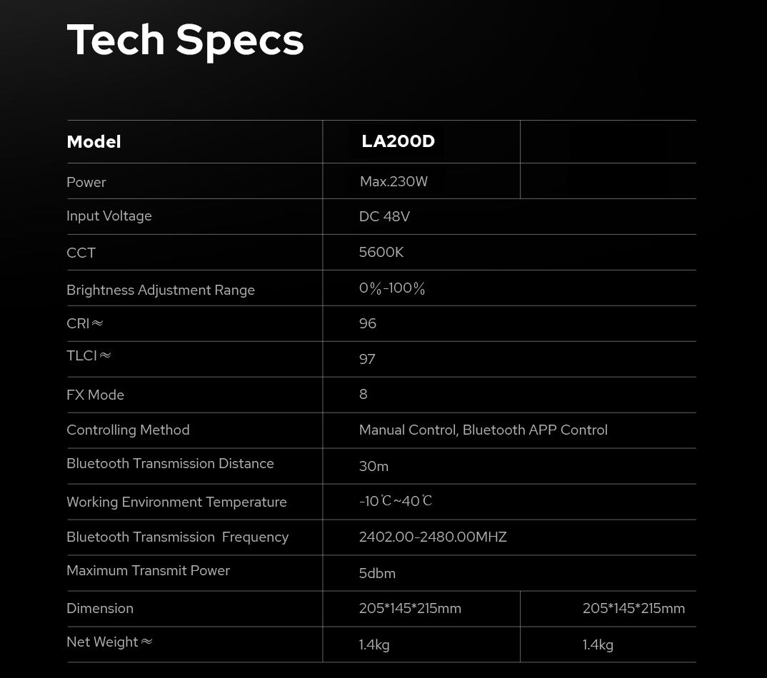 Godox Litemons LA200D (Daylight) är en mycket modern och kraftfull och tyst 200W-videobelysning, FX-effekter och Bluetooth-stöd för smidig styrning via APP. Belysningen avger ett flimmerfritt dagsljus (5600°K), med ett högt TLCI-värde (Television Light Consistency Index, TLCI ≥ 97+ och CRI: 96+) för bättre färgåtergivning. Ljusstyrkan är imponerande 101.000 Lux/1m vid full effekt och med medföljande reflektor. Effekten är steglös ställbar från 0% till 100%. Godox Litemons LA200Dhar Bowens-fattning (Bowens/Aputure/Visico/Godox) för montering av olika ljusformare för att få full kontroll av ljusspridningen.