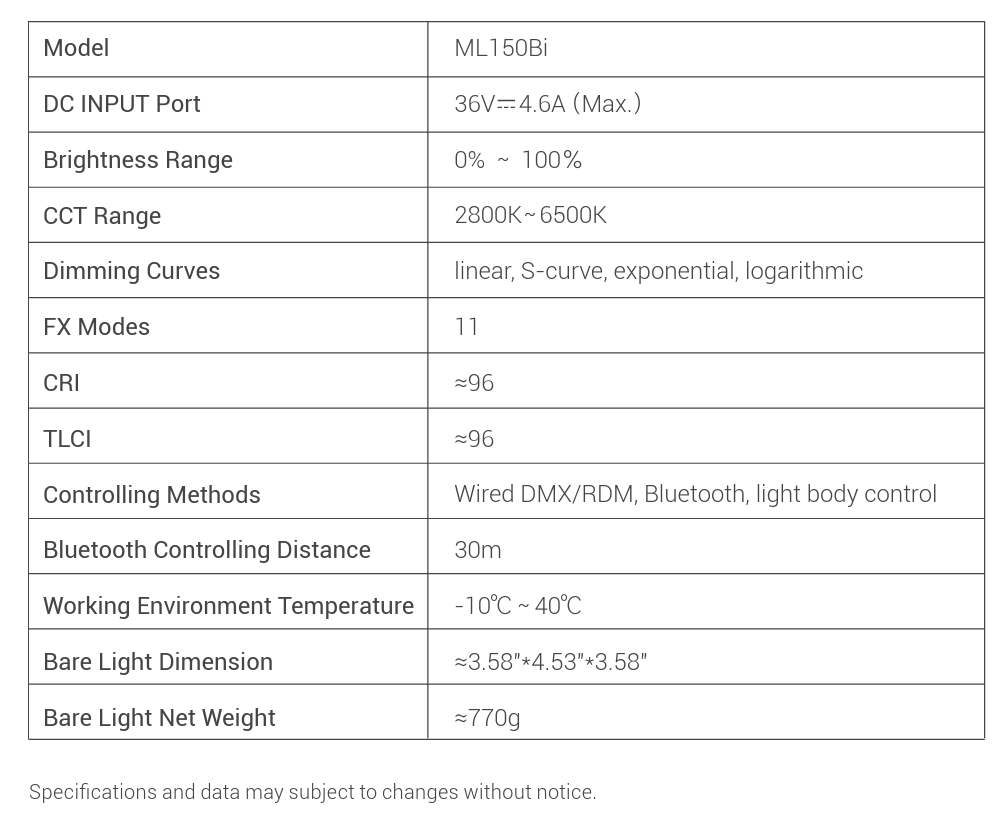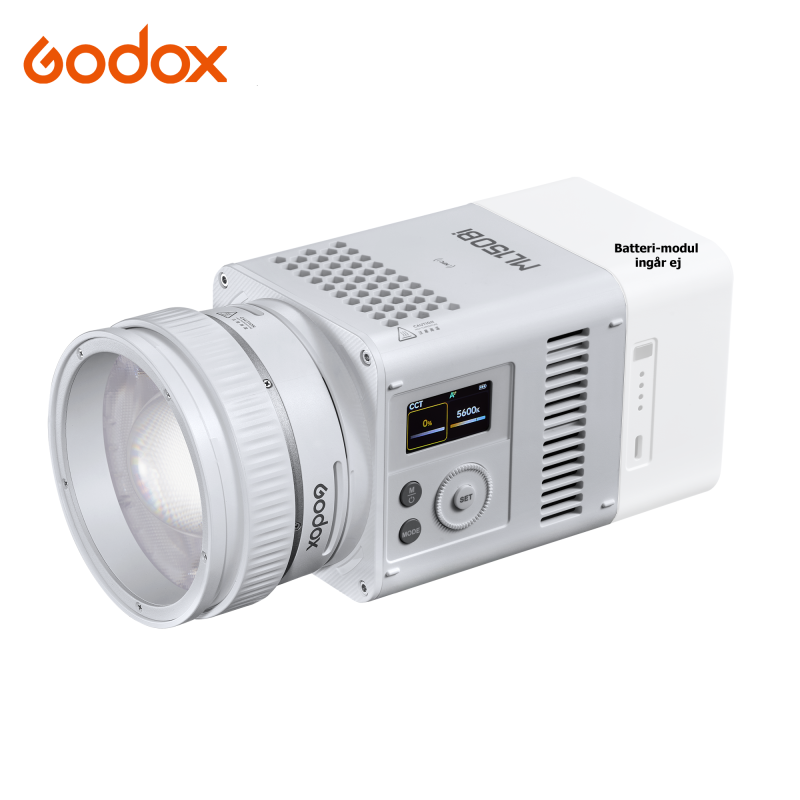 Godox ML150Bi är en ultrakompakt och modulbaserad (150W) videobelysning i ML-serien, med  ställbar färgtemperatur från 2800K till 6500K, NFC-chip, DMX och Bluetooth-stöd (Styrning via Smartphone APP).  Belysningen levereras med Godox ML-Z Zoom reflektor (med lins), som ger i spot-läget imponerande 61,054 lux på 1 meter! Naturligtvis så har belysningen Godox X-bajonett, vilket gör att ljusformarna blir lättare och kompaktare än traditionella ljusformare. Även reflektorn har blivit kompaktare tack vare en optisk konstruktion med en lins och Zoom-funktion och magnetfäste för diffusorer mm. Om du redan har ljusformare med Bowens-bajonett, så kan man köpa till en Bowens-adapter så att dina gamla ljusformare passar till ML150 Bi-color.  Tack vare modul-konstruktionen, så kan man montera ett design-anpassat ML-BA batteri (ingår ej) bak på belysningen.  Batteriet är på 95.04Wh och effekten på belysningen begränsas till cirka100W. Det följer med en V-mount batterifäste (ML-VMA), som gör det möjligt att montera och strömförsörja belysningen från ett V-mount batteri (batteri ingår ej). För maximal ljusstyrka (>150W) rekommenderas att man kör med V-mount.  Om man hellre vill driva belysningen med NP-F batterier, så finns ML-NPA  batterifäste i tillbehörssortimentet.