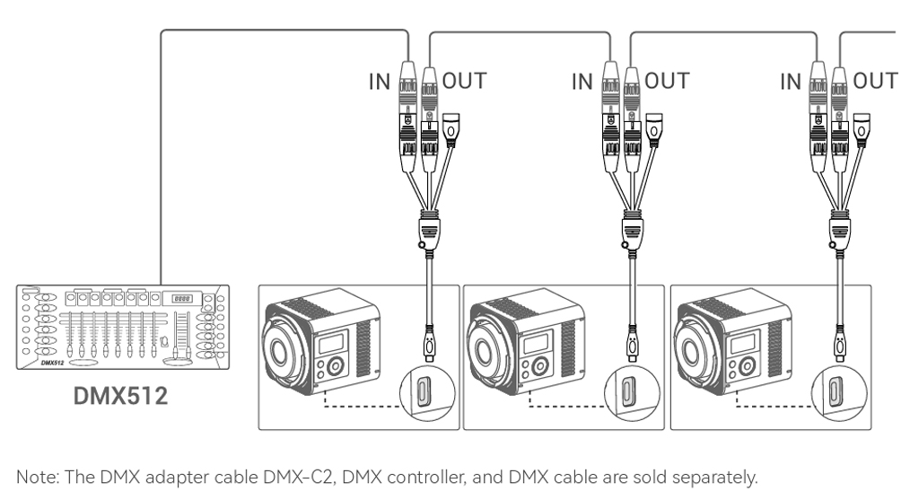 Det är möjligt att koppla ihop flera belysningar och styra dem via ett DMX.