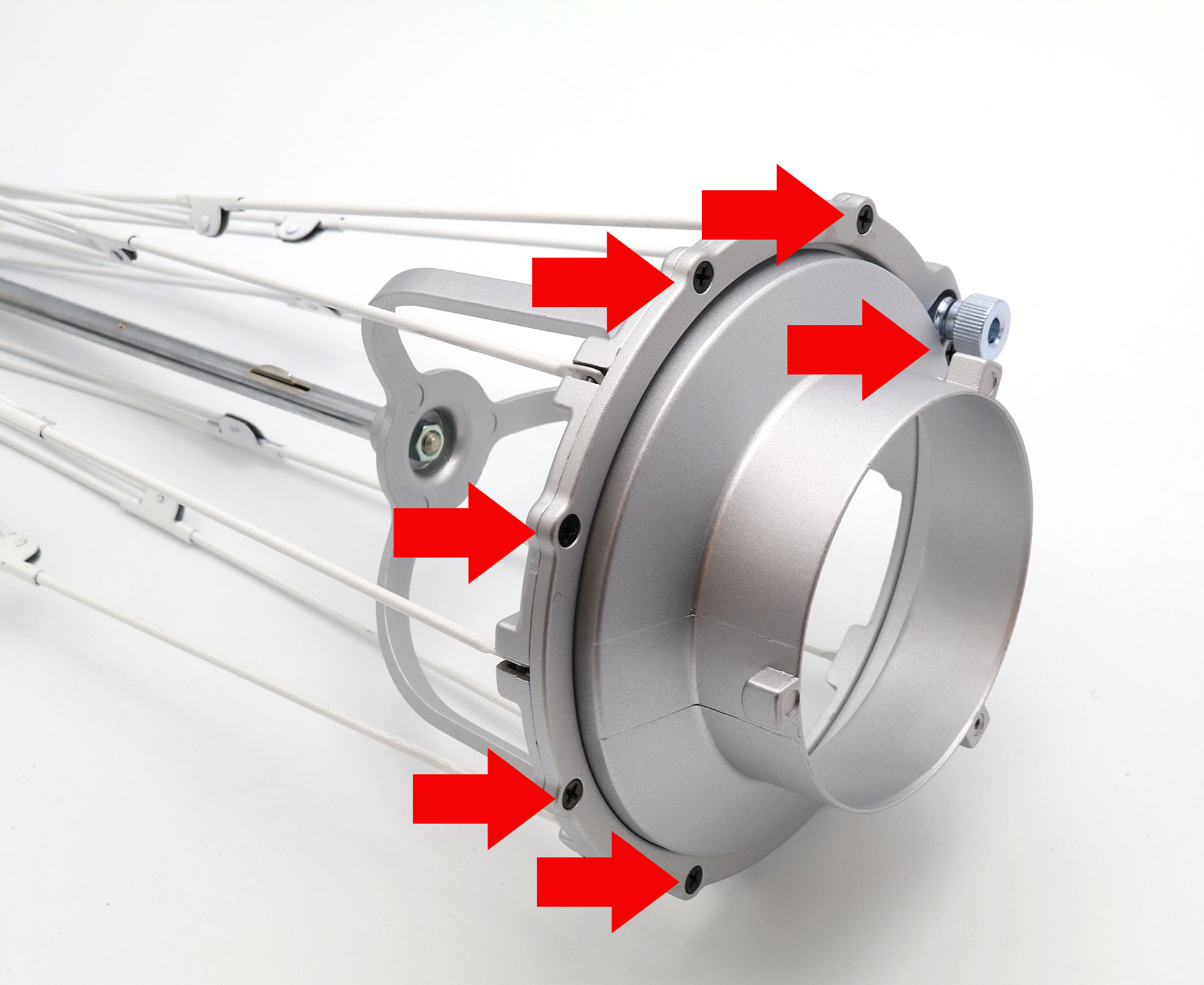 Lossa skruvarna och låsskruven så att speedringen (för Bowens) kan avlägsnas.( 8 st svarta skruvar och låsskruv).