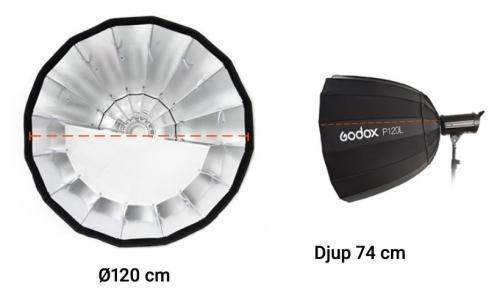 Godox P120L är en Ø120 cm parabolisk professionell softbox, med Bowens fattning och dubbla diffusionsdukar, som ger ett fokuserat mjukt ljus av högsta kvalité. Till skillnad från vanliga softboxar, så har softboxen djup paraboloidform, som gör att ljuset från softboxen blir mera riktat och kan t.ex användas på lite längre avstånd från motivet. Tack vare att softboxen har dubbla diffusionsdukar, så får man ett fantastiskt mjukt och fint ljus. Perfekt softbox att använda för t.ex porträtt, då en 16-kantig octobox ger rundare och mera naturliga reflexer i pupillerna (Vanliga Octoboxar är bara 8-kantiga...). För att skapa ett hårdare och krispigare ljus kan både den inre och den yttre diffusorn tas bort. Softboxen passar lika bra till LED belysningar som till studioblixtar med Bowens fattning.