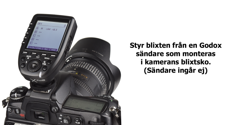 - Integrerat 2,4GHz Godox Radiosystem för styrning av studioblixten