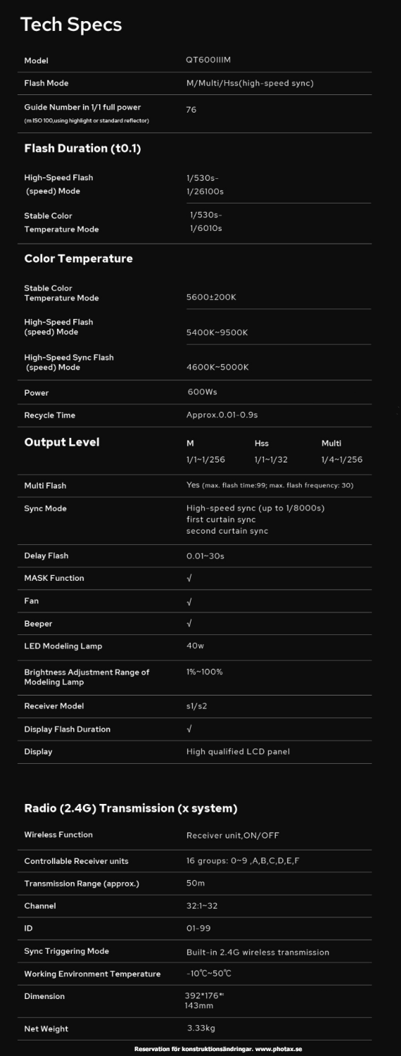 Godox QT600IIIM är en professionell, manuell studioblixt , med mycket snabba uppladdningstider, korta brinntider och stöd för High Speed Sync (slutartider upp till 1/8000 sek). Blixten har fått ny modellbeteckning (III) , ny teknik och ny design. Inställningsljuset har t.ex blivit uppdaterad till modern LED-teknologi och blixten har fått större effektomfång. Tack vare blixtens mycket snabba uppladdningstider så kan man hålla ett högt fotograferingstempo, utan risk för svarta bildrutor eller ojämnt exponerade bildserier. Blixten är designad för yrkesbruk och håller mycket jämn färgtemperatur (5600°K), med max ±200K i Stable Color Mode. Studioblixten har mycket korta brinntider, som gör det möjligt att "frysa" snabba händelseförlopp och ta snabba bildserier.